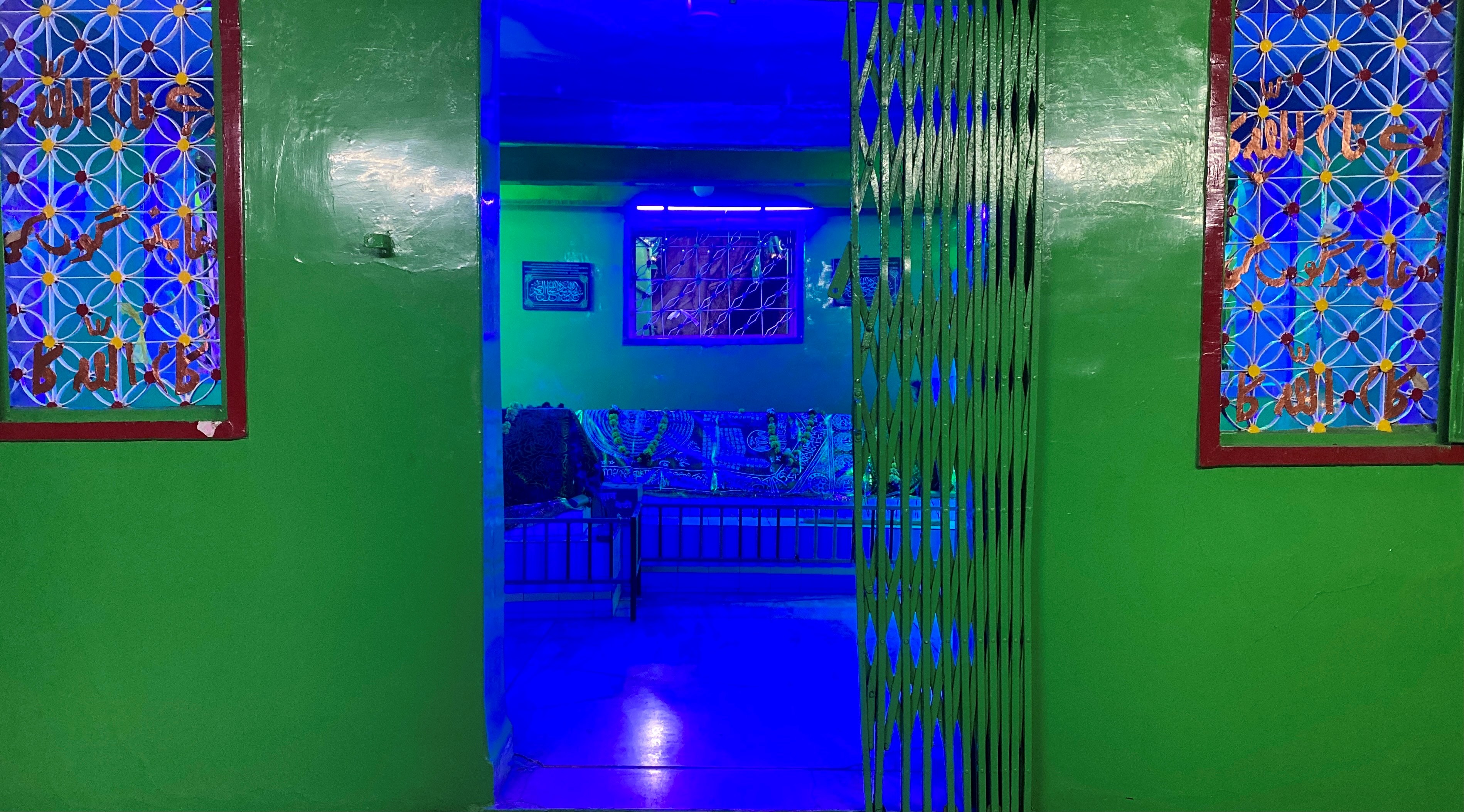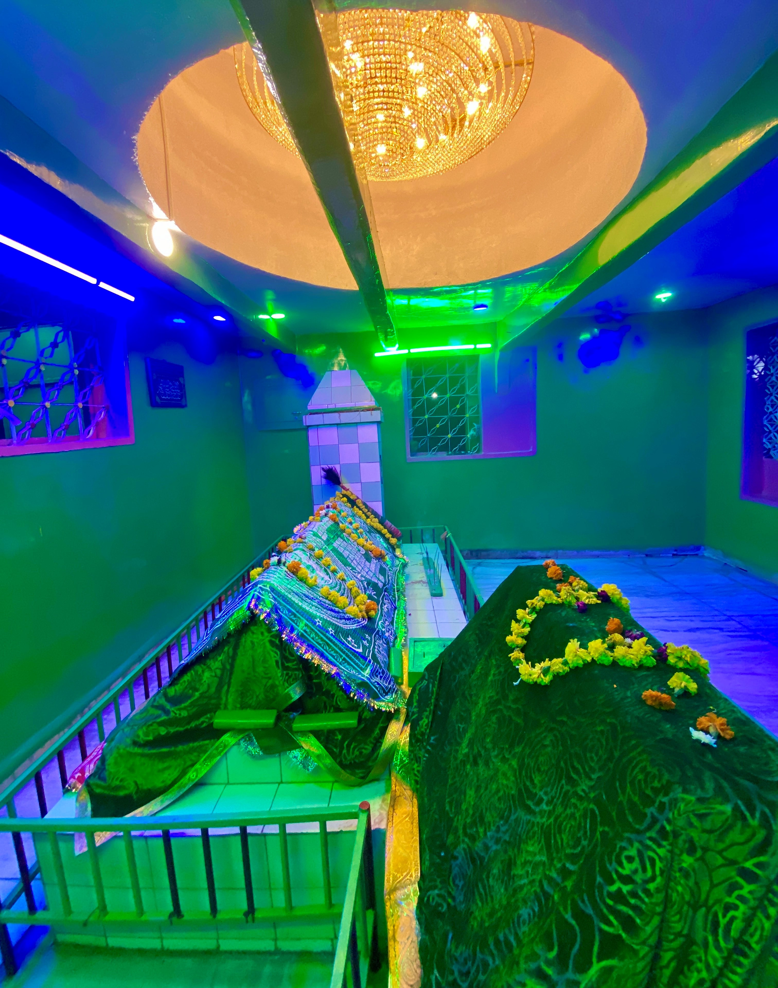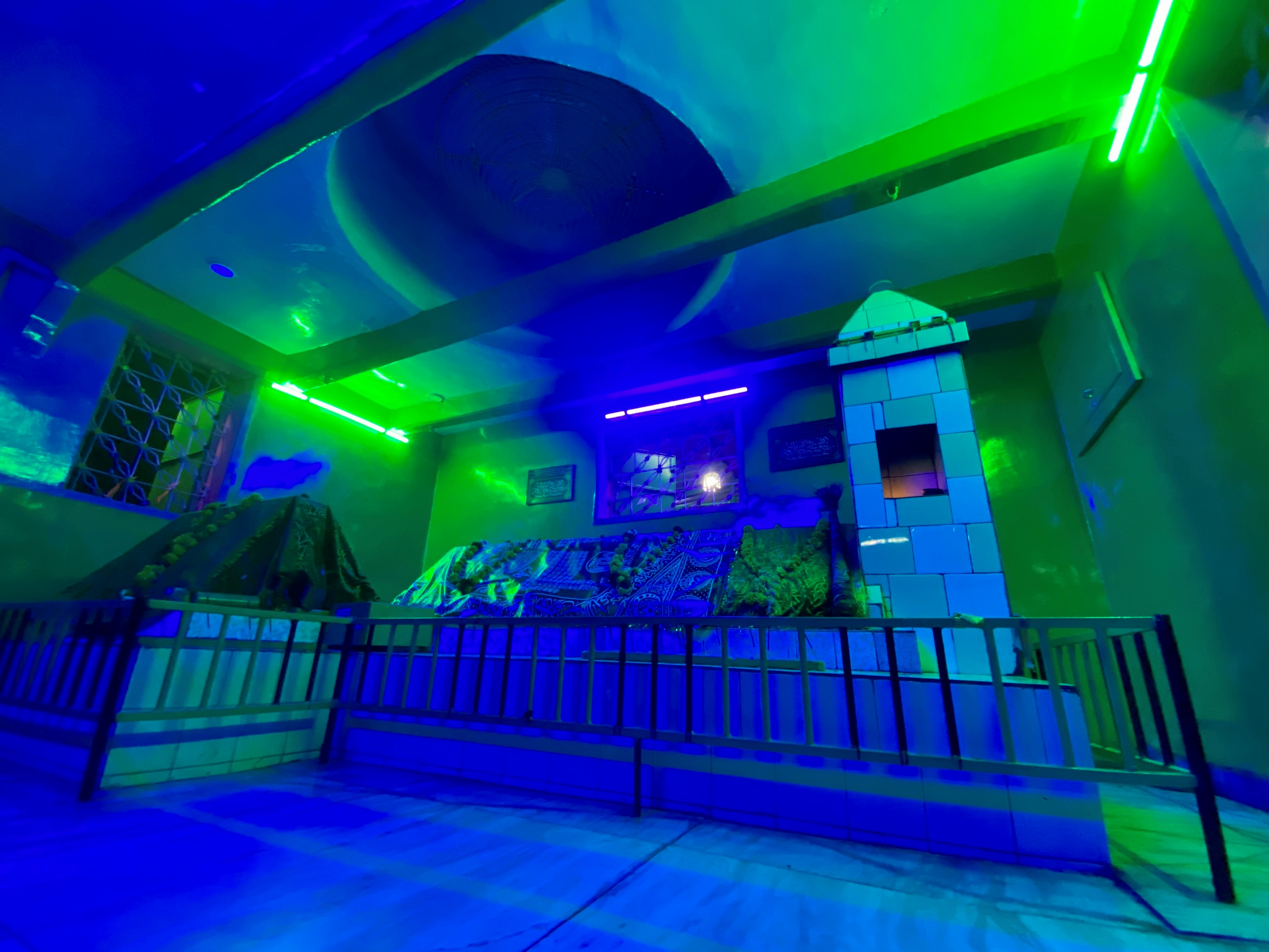 During the course of our conversation, in a very casual manner, he told me that during the last Muhharam, he got the whole premises painted and repaired. The interiors of the shrine were bathed in the beautiful soft light of blue-green turquoise hues. When I expressed my desire to click the pictures of the place for my memories, with the enthusiasm of a child who has been asked to show his newly bought toy, he switched on the bulbs of a huge chandelier, beautifully hanging inside the dome of the building. It was intricately designed glass fixture and was the centrepiece of the shrine. When I inquired about the expenditure on the decorative piece and who paid for it, with a tinge of pride, he disclosed that he mainly funded it from his savings and few odd donations he received from the visitors. It was a pleasant surprise to hear these words from a common man as he said something very beautiful and mature and I think he does not even realise that his actions are a lesson for humanity. First of all, even being a Hindu, he is maintaining a Muslim Sufi shrine and moreover, he is taking care that the local customs of Muslims are respected. Co-inhabiting in a town with Shia Muslims, Vijay understands the relevance of Muharram and considering it to be auspicious, he got the shrine maintained and repaired during that time. (Something similar to maintaining and cleaning the houses during Diwali by Hindus). The enthusiasm and calmness of Vijay were infectious and his conduct had a positive aura and vibes around it.